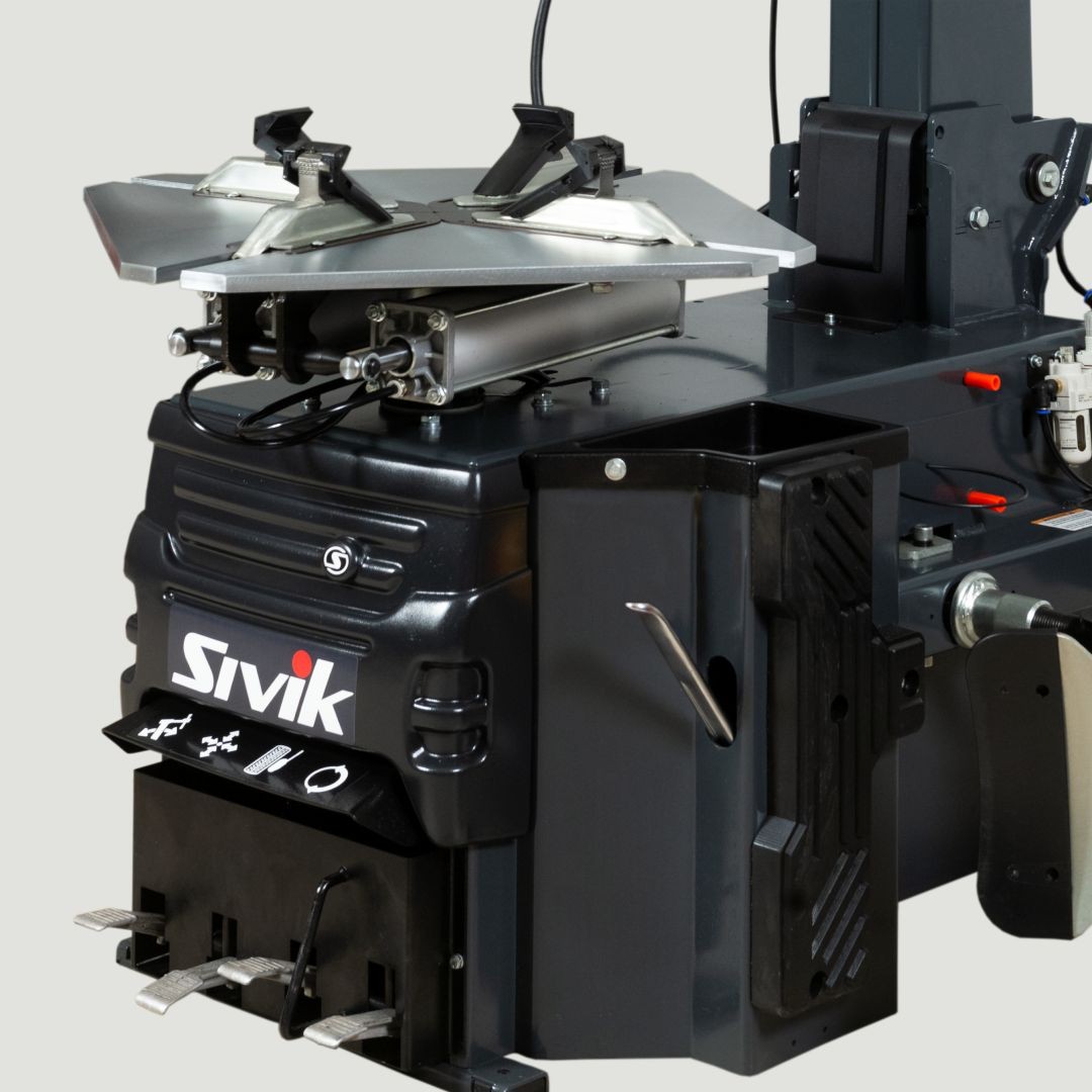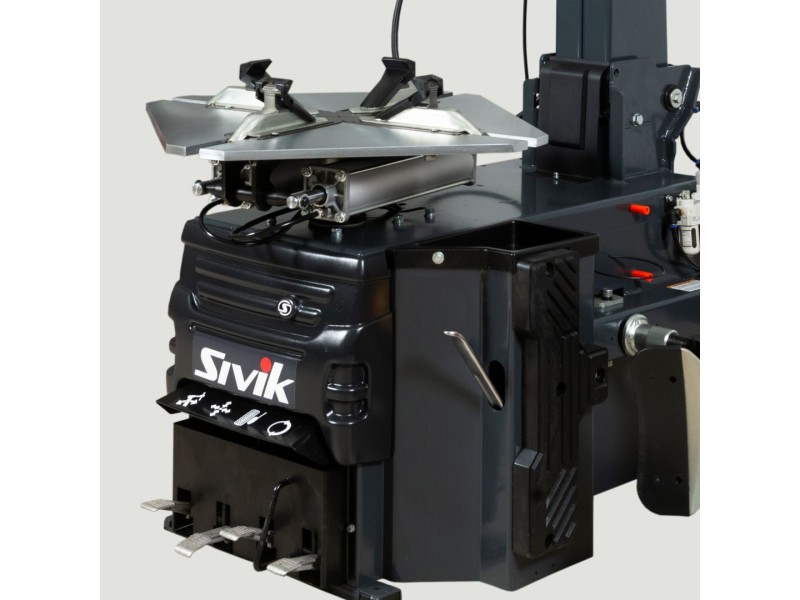 - Станок оснащен двухскоростным столом (управление скоростью с помощью педали). Цилиндр отрыва борта одностороннего действия с возвратной пружиной существенно увеличивает скорость отрыва борта. Конструкция и размер рабочего пространства отжимной лопатки позволяют эффективно работать с большими и широкими колесами