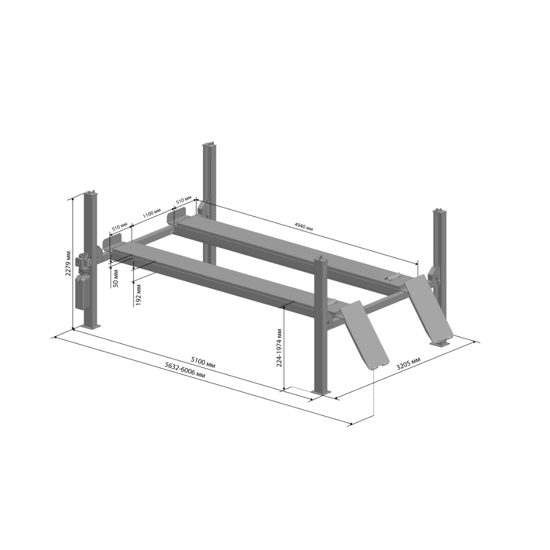 Электрогидравлический четырехстоечный подъёмник грузоподъемностью 5 т для обслуживания легкового транспорта