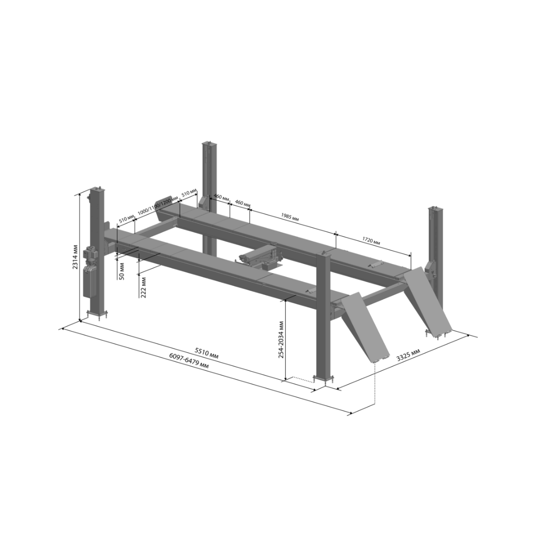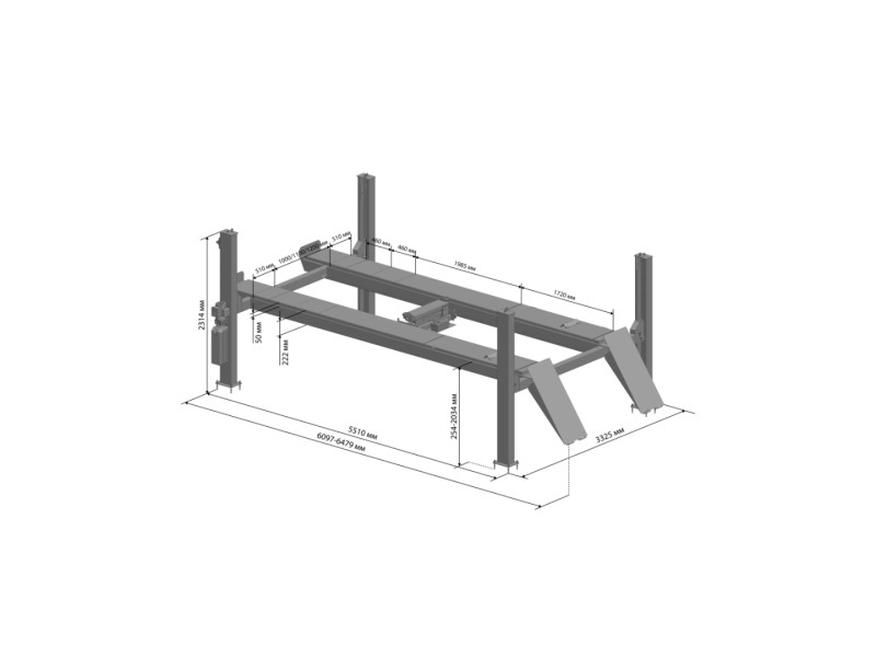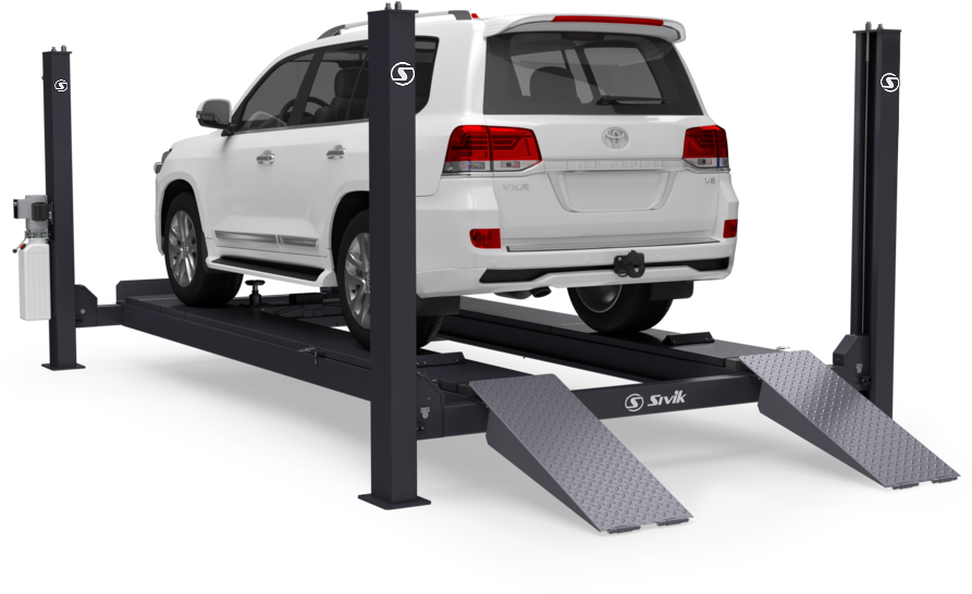 - Удлиненный электрогидравлический четырехстоечный подъёмник грузоподъемностью 6,5 т для обслуживания легкового и коммерческого транспорта
