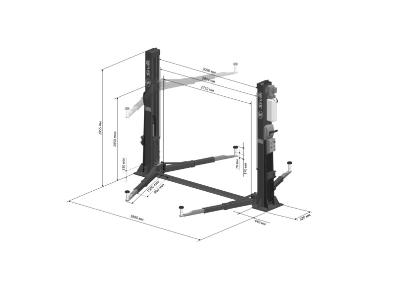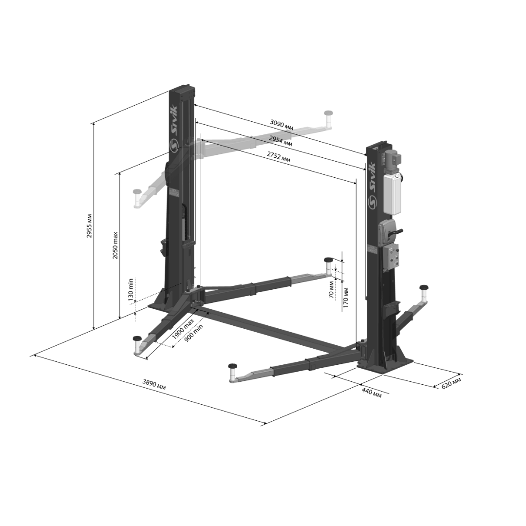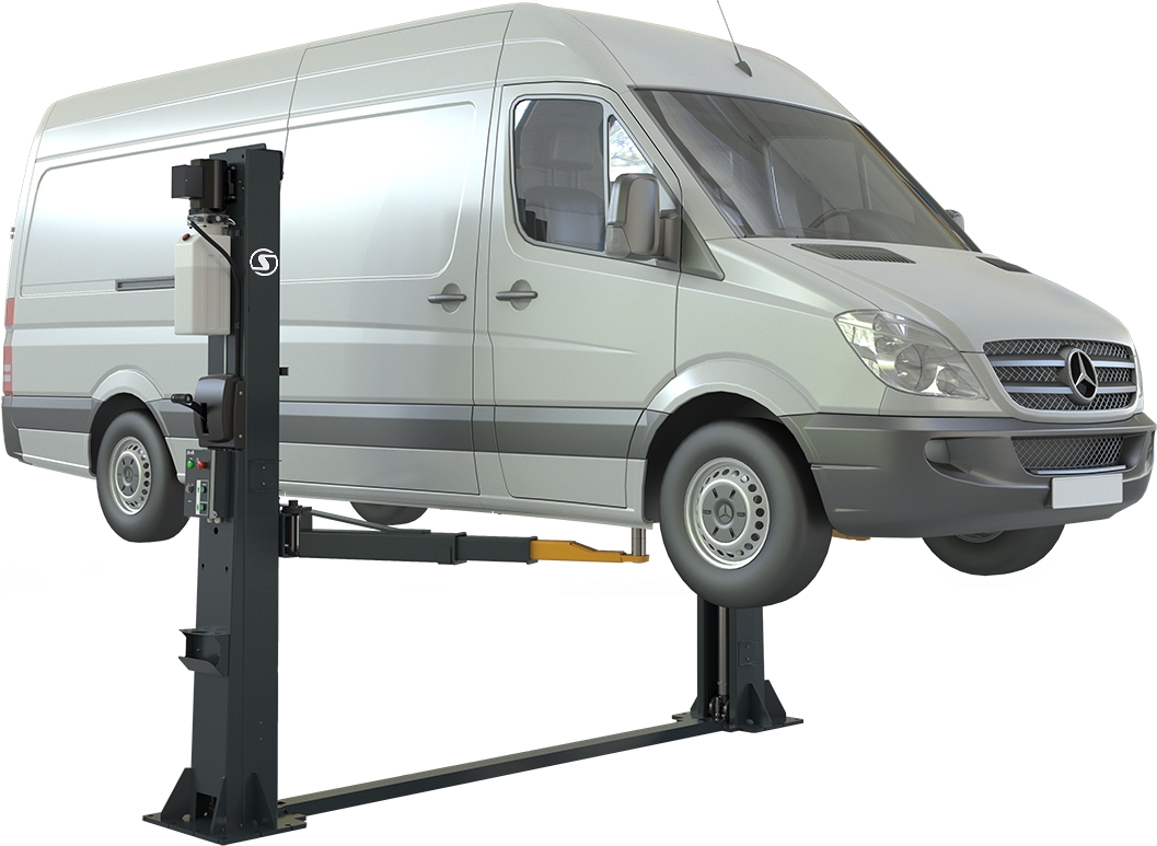 - Электрогидравлический двухстоечный подъемник с нижней связью для легковых автомобилей, внедорожников и легкого коммерческого транспорта общей массой до 5т