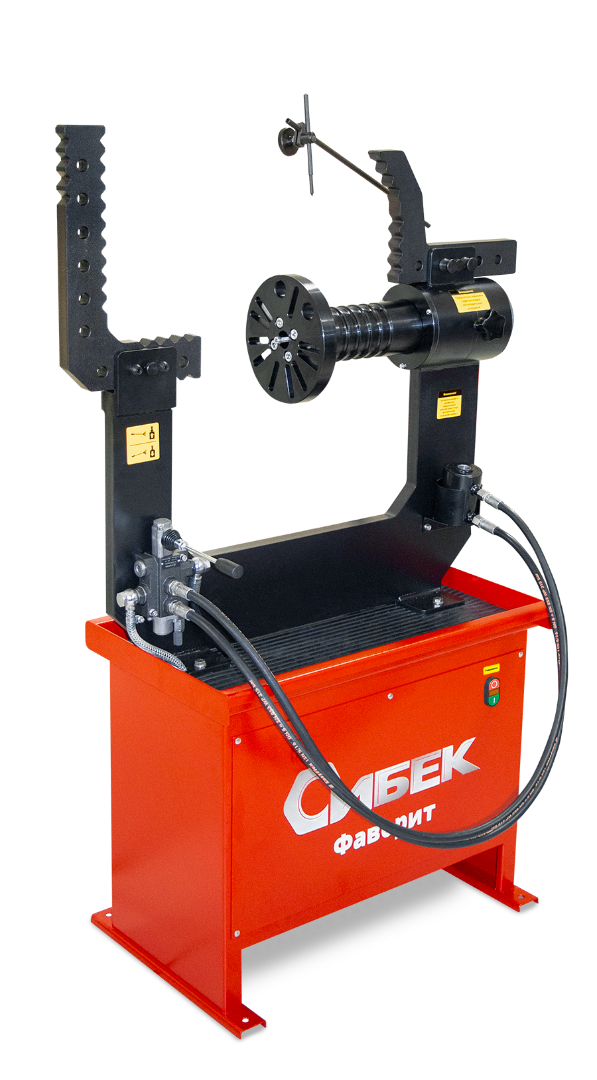 Ремонтируемый диск закрепляется на планшайбе, группа пазов которой позволяет зафиксировать любой диск вышеуказанного размера. Гидравлический привод стенда «Фаворит» позволяет достигать максимального усилия в зоне правки до 3700 кг, что, в большинстве случаев, позволяет полностью восстановить геометрию ремонтируемого диска. Комплектуется сменными рихтующими насадками и рабочими штоками. Для хранения набора вспомогательных инструментов в конструкции стенда предусмотрен инструментальный ящик. Управление рабочим гидроцилиндром осуществляется при помощи гидравлического распределителя со встроенным редукционным клапаном и регулятором давления. Гидроцилиндр приводится в действие давлением масла, создаваемым масляным насосом. Масляный насос, размещенный внутри корпуса стенда, является основой гидропривода «Фаворита». Вращение насоса осуществляет электродвигатель, соединенный с насосом через муфту. На обратной стороне струбцины расположен указатель биения, представляющий собой металлический стержень с острым основанием. Указатель биения служит для четкого определения места ремонта, особенно в заключительной стадии.