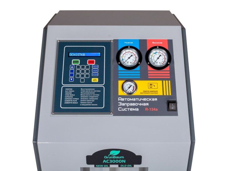 GRUNBAUM AC3000N - полуавтоматическая установка для заправки автомобильных кондиционеров, позволяющая выполнить полный цикл обслуживания системы AC любого автомобиля с газом R134a. Многие функции выполняются в полностью автоматическом режиме, что сокращает время обслуживания и делает работу комфортной.